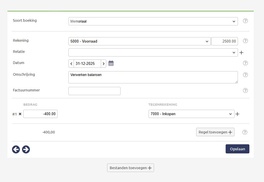 Dit doe je door via het memoriaal een boeking te maken om de voorraad weg te boeken. Als eerste zet je de rekening op Voorraad.